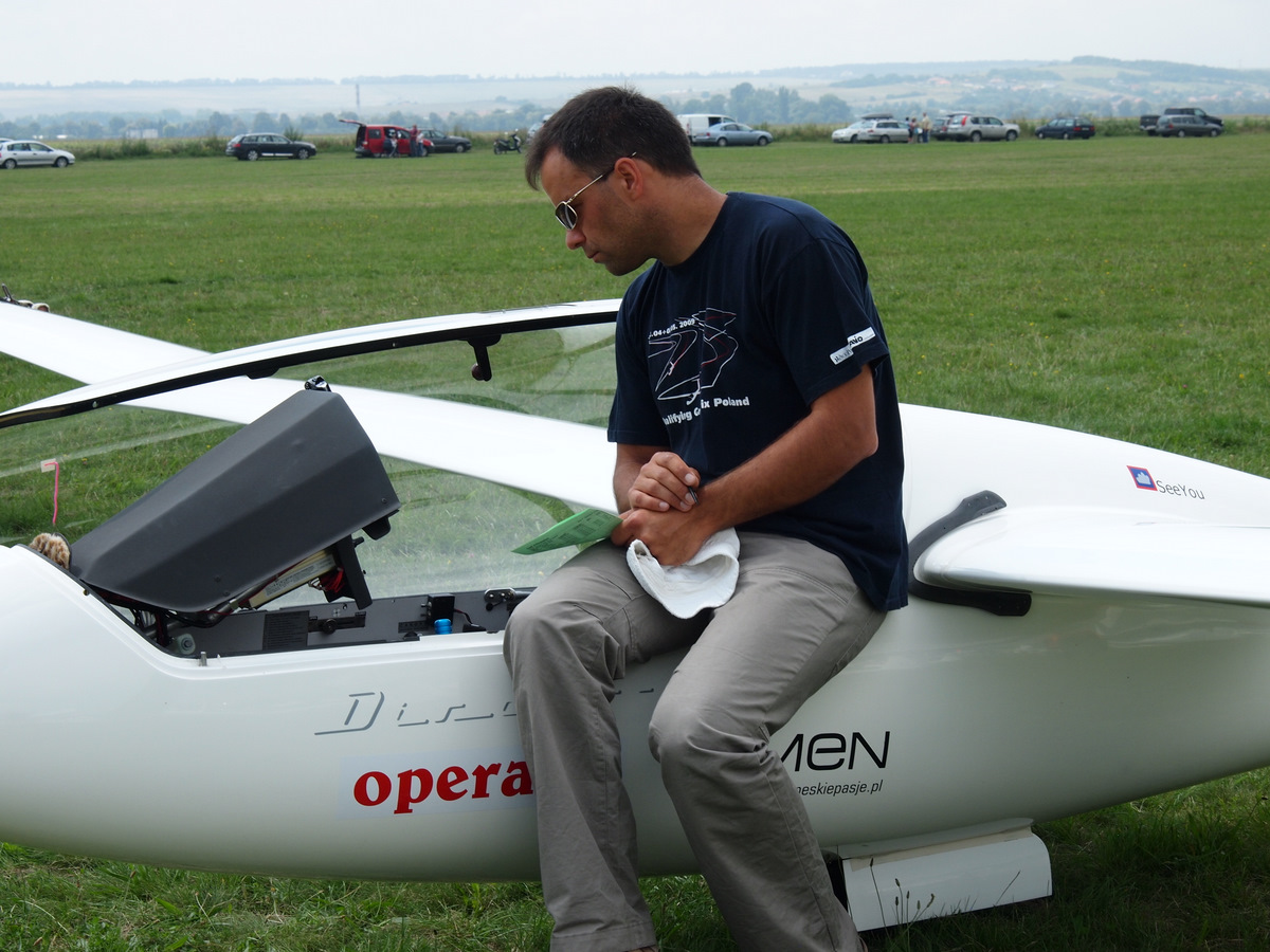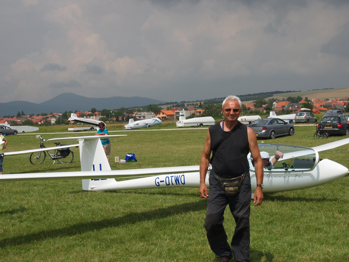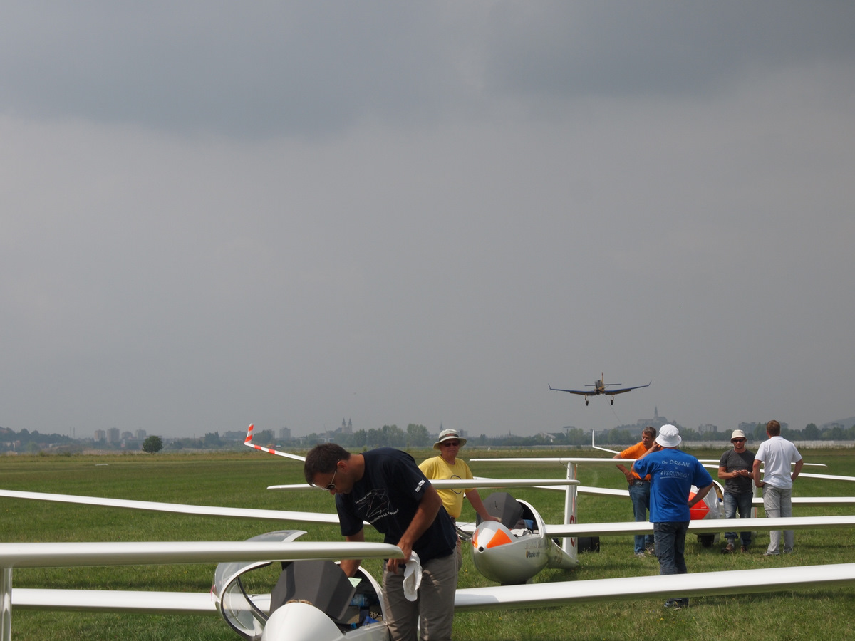 Ranek przywitał nas w typowy już sposób, czyli pełnym pokryciem nieba chmurami warstwowymi i dodatkowo mgłami, które przesłoniły widok na  topole nad rzeka po drugiej stronie lotniska. Nitra i południowa Słowacja znów  znalazły się pod wpływem niewielkiego niżu z centrum nad Budapesztem, którego wpływ był widoczny w niższej atmosferze. Wyraźnie  można było oglądać na zdjęciach satelitarnych chmury wirujące w lewą stronę wokół lotniska.  Z tego powodu ich warstwy uniemożliwiały słońcu nagrzewania powierzchni ziemi i lotnisko było zasnute mgłą . Młody meteorolog bez entuzjazmu przedstawił nam swoją wizję na dalsza część dnia.Trudno mu się dziwić, bo diagramy z okolicznych wzlotów aerologicznych odzwierciedlały niemal identyczne , tylko  jakby  narysowane nieco drżąca ręką , nakładające się na wykres adiabaty wilgotnej  . W tym wilgotnym powietrzu szybko i wysoko pięły się brzemienne w wodę giganty.Sytuacje mogło uratować jedynie rosnące ciśnienie.I tak się chyba stało, bo ostatecznie rozwój chmur ku stratosferze został nieco przyhamowany a  podstawa chmur podniosła się około południa na 600m nad poziom lotniska. Chwilami było nieco lepiej, ale na trasie były momenty, że przelatywaliśmy nad  chmurami pełzającymi niemal po ziemi…   Początkowo przez długi czas pogoda nie dawała szans na loty szybowcem, ale  po południu atmosfera nieco się podgrzała i zaczęło przeświecać słońce , podświetlające  wieże piętrzących się wokół chmur. W tej sytuacji na pierwszy ogień w powietrze znów wzbiły się PW5 , by sprawdzić noszenia. Ponieważ jedna PW5, wybroniła  się przed lądowniem  z wysokości 70 m nad lotniskiem, poderwano w górę także pozostałe klasy.  Ostatecznie podstawa podniosła się  do „zawrotnej”  wysokości 800 m nad poziom lotniska , toteż  nikt nie czekał z odlotem natrasę. My startowaliśmy pod koniec kolejki, więc do linii startu musieliśmy się  przebijać  się 13 km przez deszcz i  lotem ślizgowym wracać do aktywnego cumulusa nad lotniskiem. Lecąca nieco przed nami grupa z Niemcami złapała  silniejszy komin i trochę nam uciekli, ale problemy już na pierwszym PZ spowolniły tę ucieczkę. W tym obszarze mieliśmy okazję upajać się widokami znad  chmur. Było by to bardzo interesujące, ale podstawa tych chmur sięgała około 400m nad teren. Na, nasze szczęście dalej na południu , nad dolinami przy Dunaju ,  wielkie chmury nieco odżyły a burze szalały w innych rejonach, więc już bez przykrych niespodzianek ukończyliśmy  trasę.  Inne grupy miały trudniej, bo na ich trasach ziemia była bardziej wychłodzona przez obfite deszcze, mieli też duże obszary rozpadających się chmur i  trudno było się utrzymać w powietrzu. Wielkie szczęście miał Michał Lewczuk z Piotrem Pawłowskim. Gdy spadli do wysokości około 150 m nad teren zdecydowali się postawić kolumnę ze śmigłem i uruchomić silnik dolotowy, ale silnik nie odpalił. Mieli by spore kłopoty lądując z takim układem hamującym , ale trafili akurat na komin który uratował ich z opresji i pozwolił na dalsze kontynuowanie  swobodnego szybowcowego lotu. Szybowce klubowe  i Pw5  mimo poważnych kryzysów także w  w większości wybroniły się  i ostatecznie zafundowały kibicom piękne widoki grupowych dolotów. Prognozy na następne dni nadal są typowe  dla niżów węgierskich, toteż tak tu , jak i w Polsce nie spodziewamy się suszy.