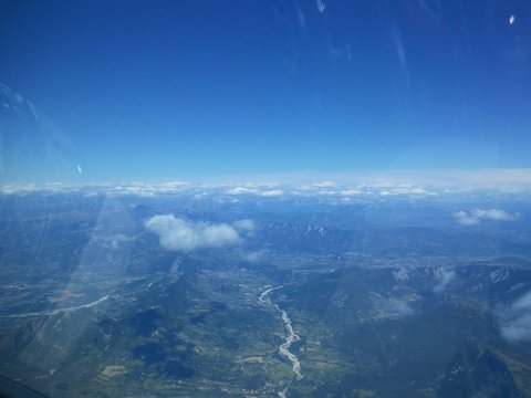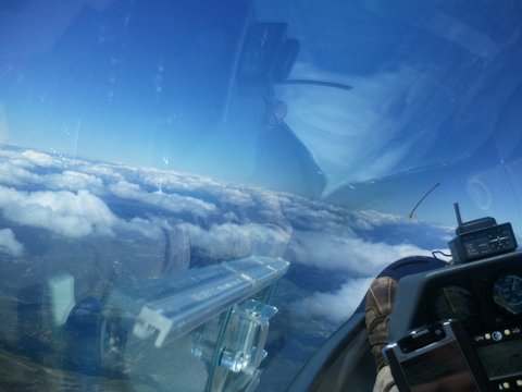 Musiałem zanurkować pod chmurę rotorową, więc chcąc uniknąć rozpędzenia Diany do dużej prędkości otwarłem hamulce aerodynamiczne i w ten sposób odlkeiłem taśmę mylarową na skrzydle. Końcówkę tego boku pokonaliśmy zgodnie pod chmurami. Ułożył się nawet niewielki szlak powstający z muru halniakowego. Po punkcie postanowiłem cofnąc się do najlepszej fali jaką spotkałemna trasie – przed zboczami Montagne de Lure. Po drodze fala nie wpasowywała się z długością w rytm pasm i nie było dobrych podtrzymań, ale fala ale de Lure wynagrodziła mi wszystko wznoszeniem, które dochodziło nawet do 6 m/sek . Francuzi wybrali trasę nieco bliżej doliny i w znanym sobie miejscu trafili falę wcześniej niż ja, więc mogli ana skróty polecieć do punktu.
