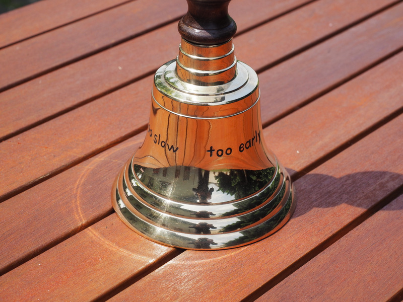 Na pamiątkę został mi podarowany „dzwonek instruktorski” z napisami Too Fast ( in lift ), Too slow ( in cruise), Too early ( pulling before lift), Too late ( catching thermals) . Dzwonek, by siedzący z tyłu nie musiał zdzierać gardła. Z pewnoscią się przyda. Ostatecznie gdyby dźwięki nie wywołały odpowiednich odruchów, dzwonek jest tak solidny, że można jeszcze nim potraktować co oporniejszych w przedniej kabinie.